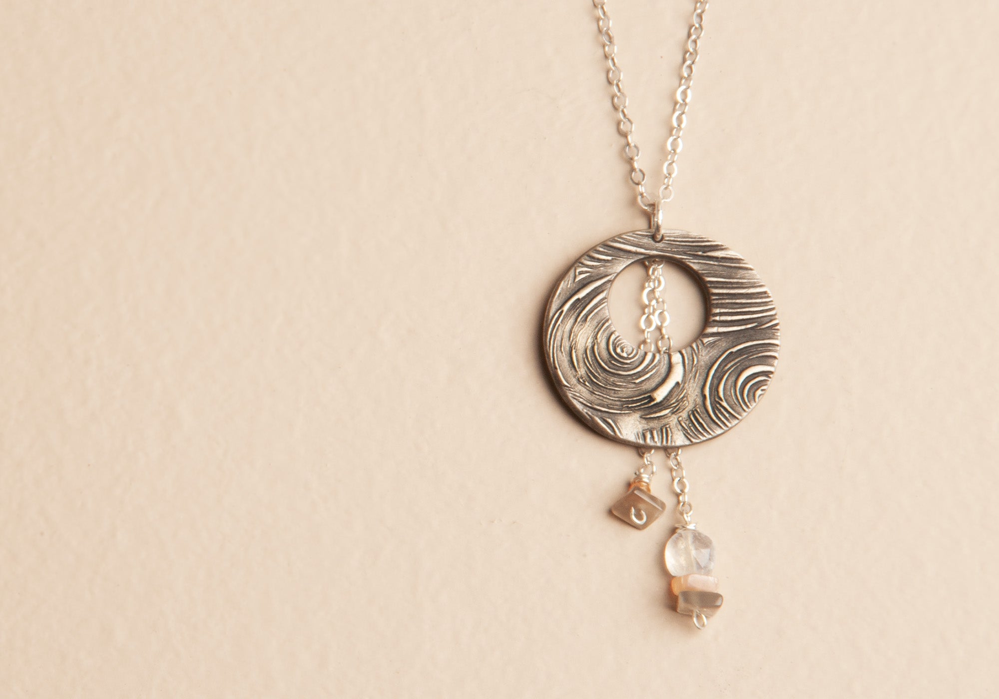 This collection was inspired by the phases of the moon, the textures of earth, and the colors of space. You’ll find deep browns, soft whites, earthy greens, and vibrant turquoise woven throughout. The crescent and full moons appear in both my wall hangings and artisan jewelry, a quiet connection between two forms of art.