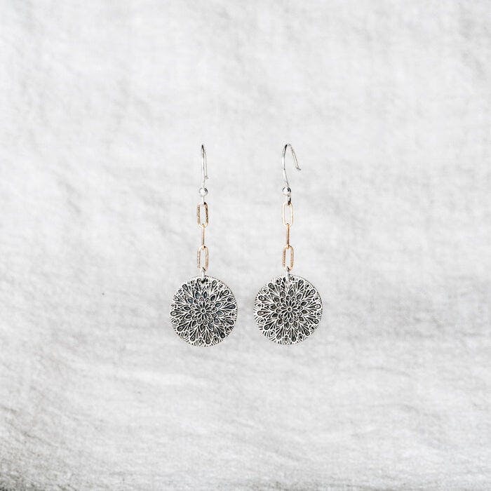 Embrace the light with our best-selling Mandala Let There Be Light Floral Dangle Earrings! Handcrafted in gleaming sterling silver and 14K gold fill, these earrings feature a delicate mandala design that adds a touch of bohemian elegance to any outfit.